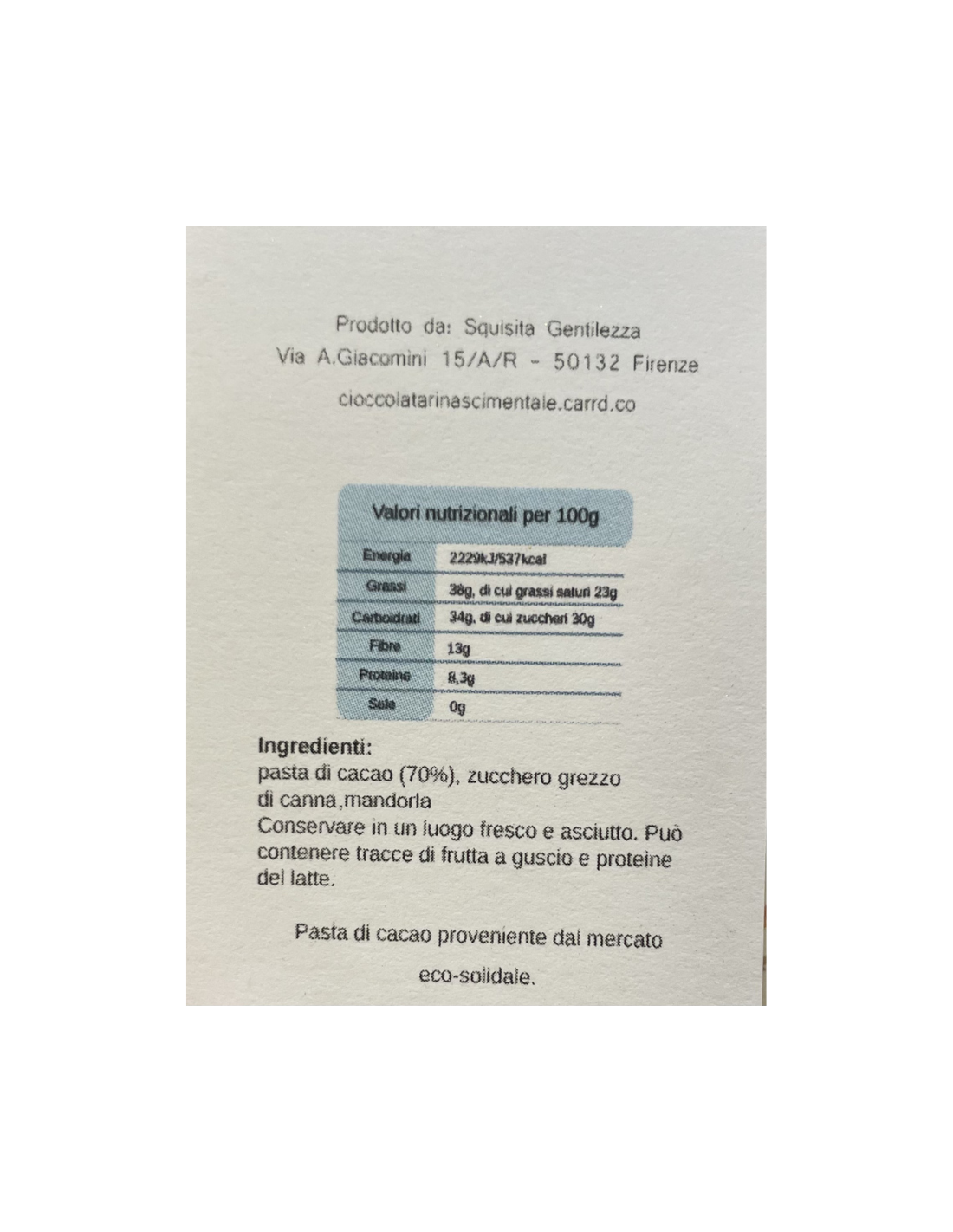 La sua friabilità e la formazione di una sottile patina sulla superficie della cioccolata è dovuta al suo antico processo di lavorazione a freddo virgola che permette il mantenimento dei sapori di ogni singolo ingrediente e determina il normale aspetto opaco della barretta, indicata anche da sciogliere in acqua calda.